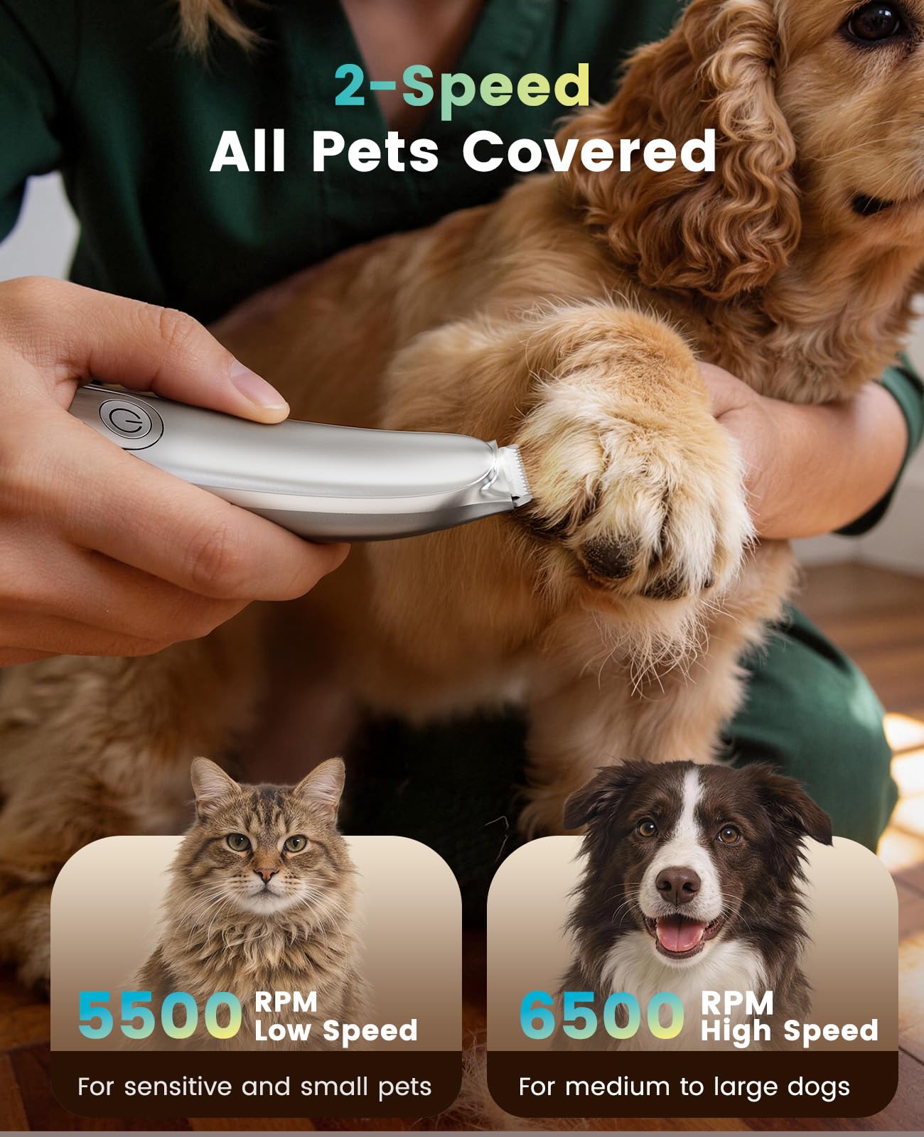 - ใ๐๐จ๐ฐ๐๐ซ๐๐ฎ๐ฅ, ๐๐ซ๐๐๐ข๐ฌ๐ ๐๐ซ๐ข๐ฆ๐ฆ๐ข๐ง๐ ใThis dog paw trimmer delivers up to 6500 RPM for smooth, powerful trimming without pulling hair. With 2-speed settings, 5500 RPM for gentle trimming and 6500 RPM for thicker paw hair, itโs ideal for sensitive cats and dogs of all sizes